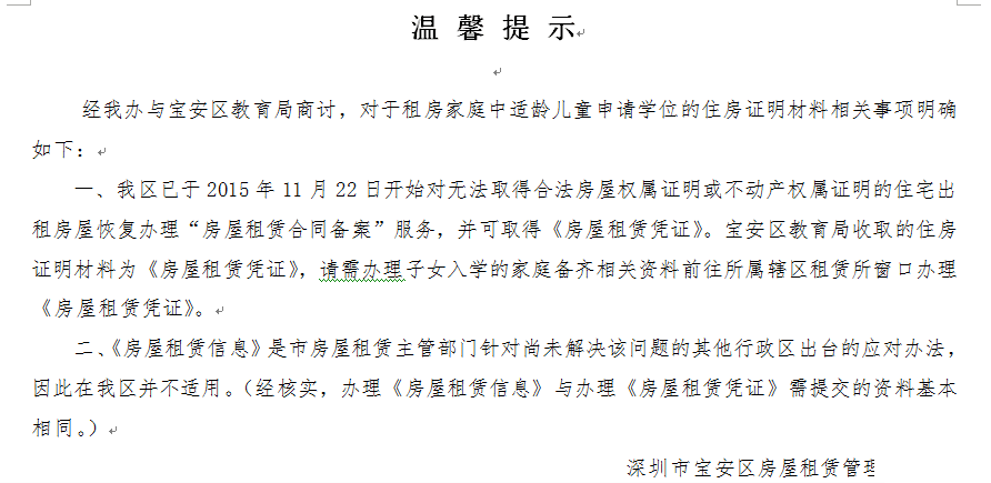 深圳宝安区教育局公布恢复办理房屋租赁凭证,《租赁信息》不适用本区,更多详情请看下文。