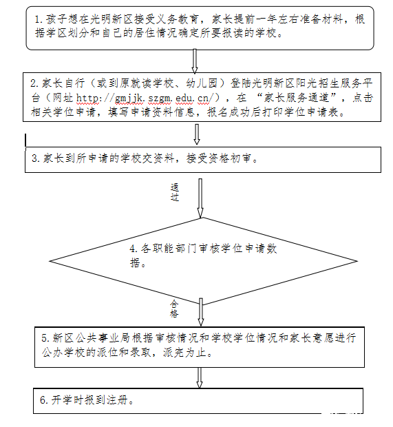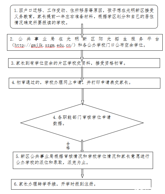 家长自行登陆光明新区阳光招生服务平台(网址http://gmjjk.szgm.edu.cn/)报名,根据实际情况填写申请资料信息,报名成功后打印学位申请表。家长应确保其填写信息的真实性,提供虚假材料除不得补交,还移交有关部门追究责任。