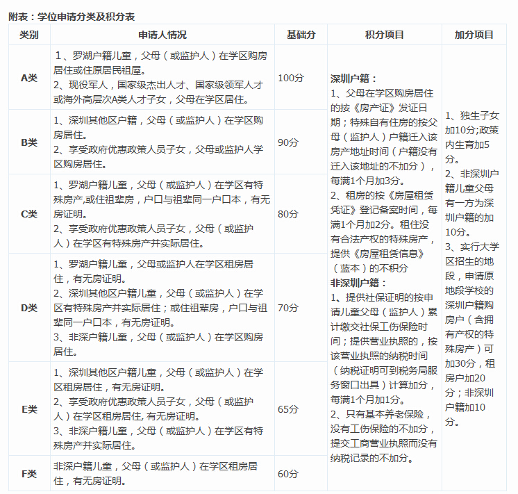 (1)深圳户籍儿童:按申请适龄儿童家长(监护人)在学区的连续居住时间加分,父母在学区购房的按房产证签发日期;特殊自有住房的按父母(监护人)户籍迁入该房产地址时间(户口没有迁入该地址的不加分),每满1个月积3分;在学区租房居住且能提供无房证明的按《房屋租赁凭证》(红本)备案时间,每满一个月积2分。租住没有合法产权的特殊房产,提供《房屋租赁信息》(蓝本)的不积分。