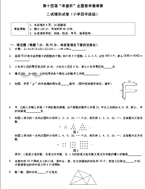 2016年深圳赛区希望杯二试四年级模拟试卷
