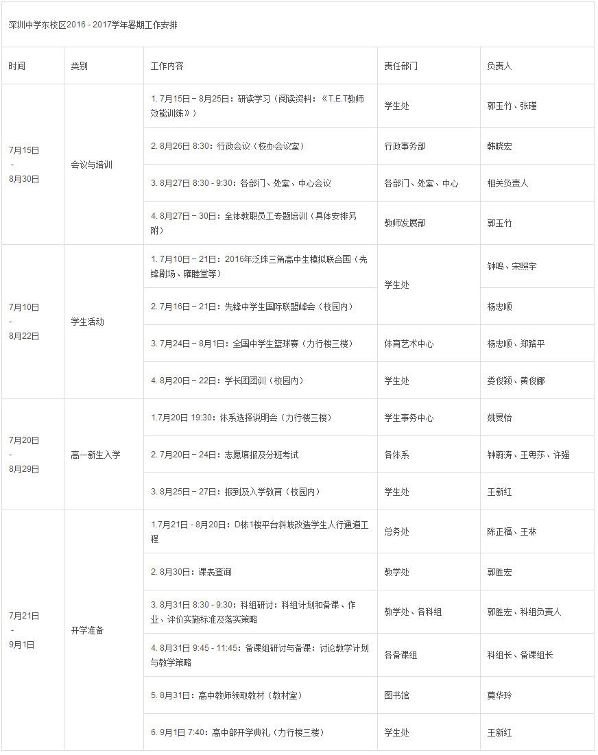 从7月15日开始深圳中学就进入2016年暑假时间了,下面是深圳中学2016-2017学年暑期工作安排,供2016年深圳小升初被深圳中学录取的新初一们参考。