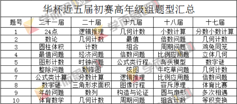 2017年深圳赛区第22届华杯赛赛事安排时间表出炉【点击查看】,12月10日就将开始深圳第22届华杯赛初赛考试。为了帮助深圳考生们更好的备考,本文将近五届华杯赛初赛高年级组试题题型汇总整理,供参考。