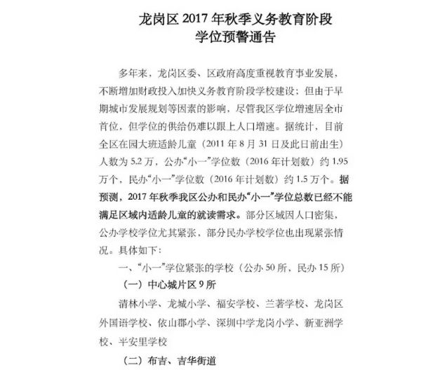 据龙岗区教育局最新消息,2017年龙岗区小学学位出现预警,以下就是2017年龙岗区秋季义务教育阶段学位预警通告的具体情况,如下: