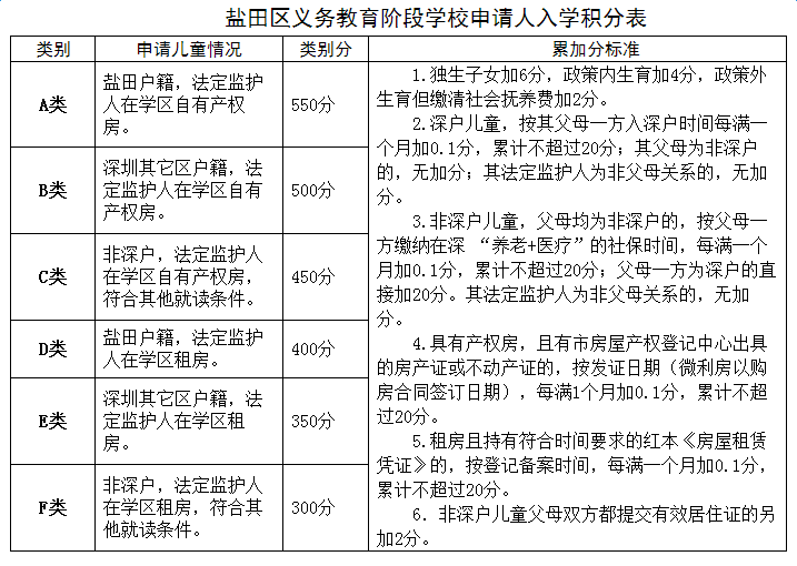 1.类别分:按申请儿童户籍和监护人住房情况,划分A、B、C、D、E、F六个学位申请类别。分类办法及对应分值见《盐田区义务教育阶段学校申请人入学积分表》(以下简称《积分表》)。
