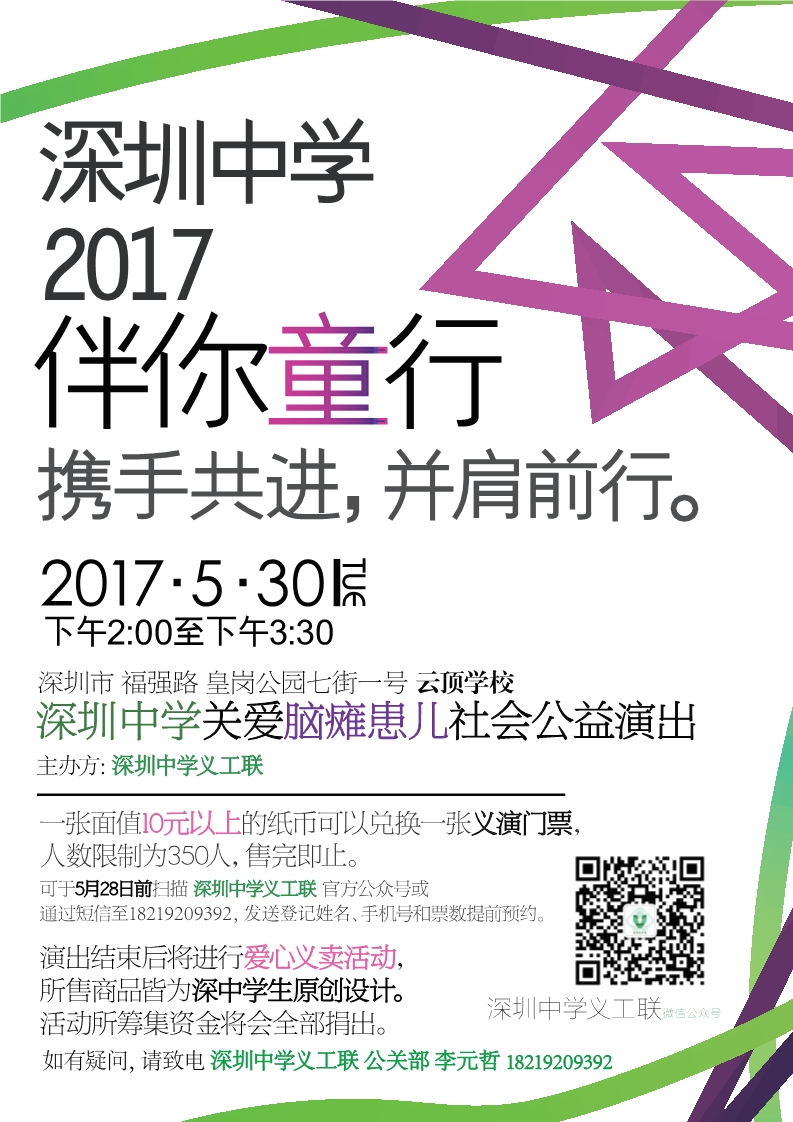 听孩子说,他们同学在的深圳中学义工联要举办一个义演活动,为脑瘫儿童筹集善款。好像整个活动从头到尾都是学生自己组织的,自己请来了节目,还设计了小商品。