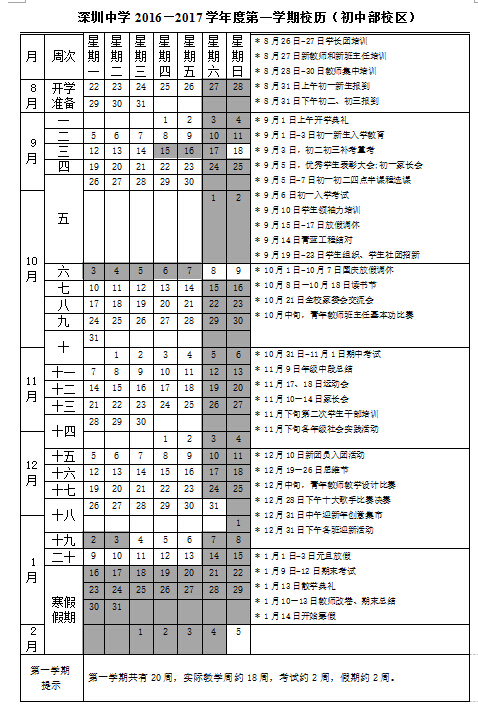 深圳中学初中部2016—2017学年第一学期校历
