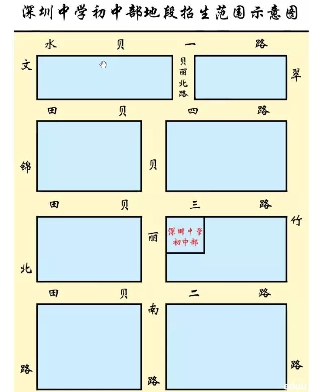 1、地段入学:田贝一路以北、水贝一路以南,翠竹路以西、文锦路以东的地段。(如图)