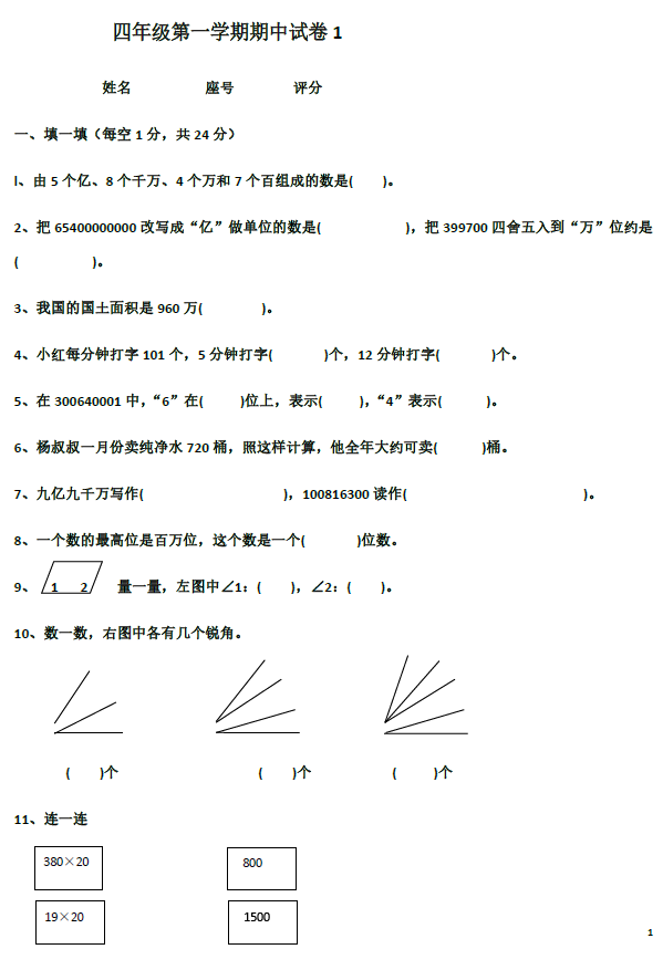 深圳小学四年级上册数学期中试题(四)