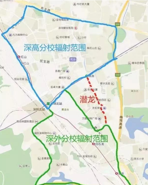 由教育局划分的深外龙华校区初中部招生范围涵盖了万科金域华府、书香门第、星河盛世等小区,而更近的潜龙花园、潜龙鑫茂花园、榕苑却拒之门外。
