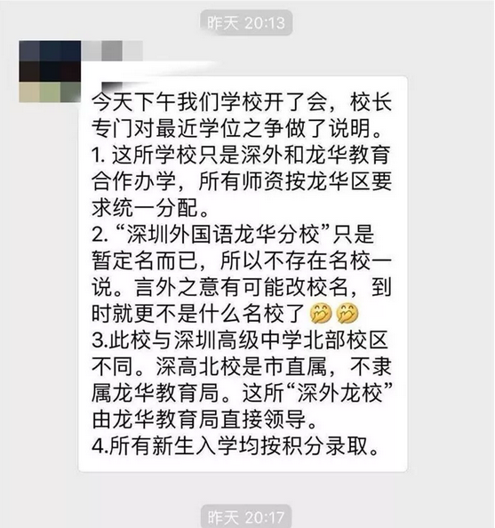 而就在近日,一位网友晒出了一张疑似相关学校传出的聊天截图,并表示“澄清:深外龙华分校由龙华教育局直接领导,后续可能更名,所以不是大家期待的名校。”