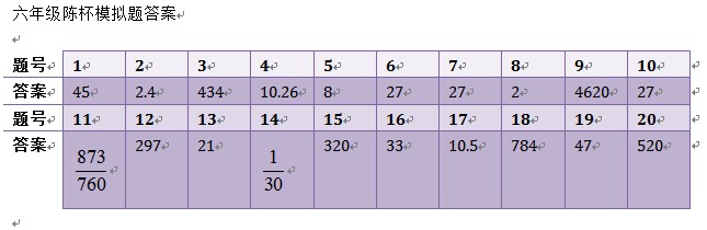 2013陈省身杯六年级模拟题答案 家长帮社区 2012-12-20 18:42:01 2013陈省身杯六年级模拟题答案 相关推荐: 2013陈省身杯六年级模拟题 2013陈省身杯五年级模拟题及答案 陈杯倒计时3天:谈谈最后几天的复习
