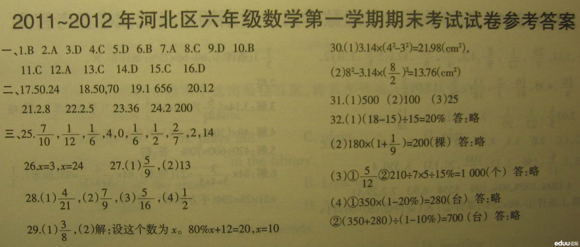 2011-2012河北区六年级数学第一学期期末试卷答案 奥数网整理 2012-12-27 15:20:37 2011-2012河北区六年级数学第一学期期末试卷答案 相关推荐: 2011-2012河北区六年级数学第一学期期末试卷 天津市小学历年六年级第一学期期末考试试题及答案汇总