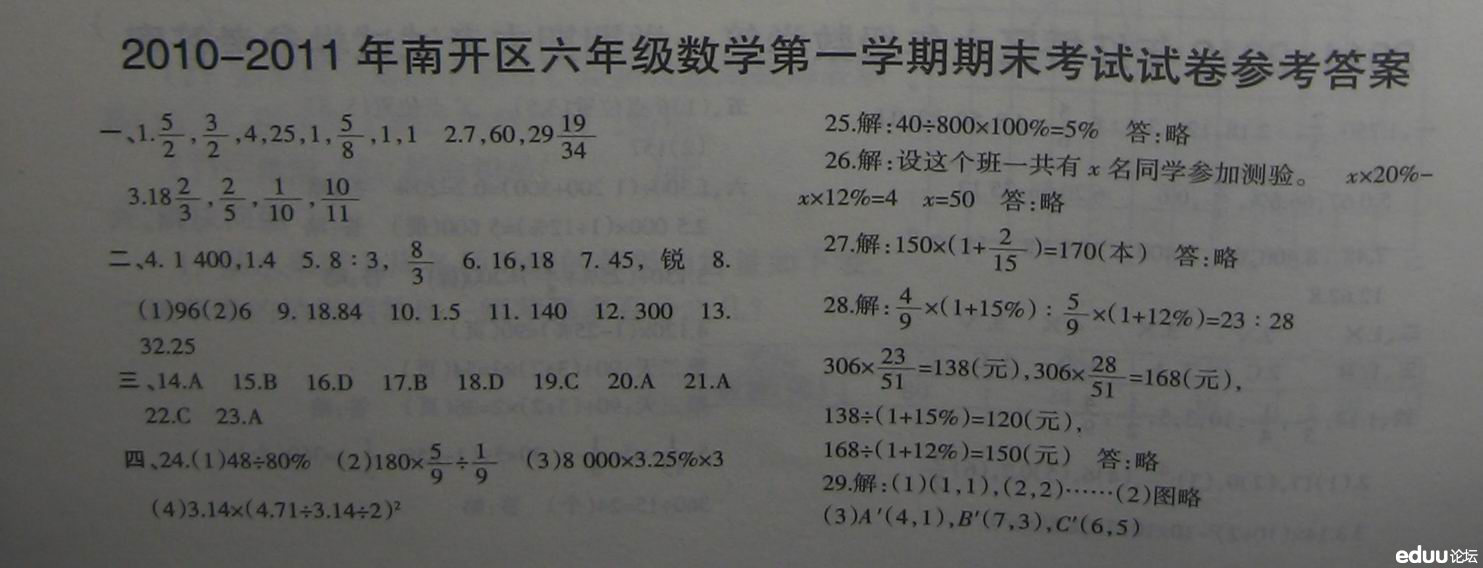 2010-2011南开区六年级数学第一学期期末试卷答案 奥数网整理 2012-12-27 16:24:15 2010-2011南开区六年级数学第一学期期末试卷答案 相关推荐: 2010-2011南开区六年级数学第一学期期末试卷 天津市小学历年六年级第一学期期末考试试题及答案汇总