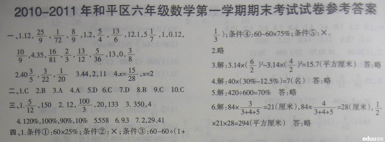 2010-2011和平区六年级数学第一学期期末试卷答案 奥数网整理 2012-12-27 17:45:29 2010-2011和平区六年级数学第一学期期末试卷答案 相关推荐: 2010-2011和平区六年级数学第一学期期末试卷 天津市小学历年六年级第一学期期末考试试题及答案汇总