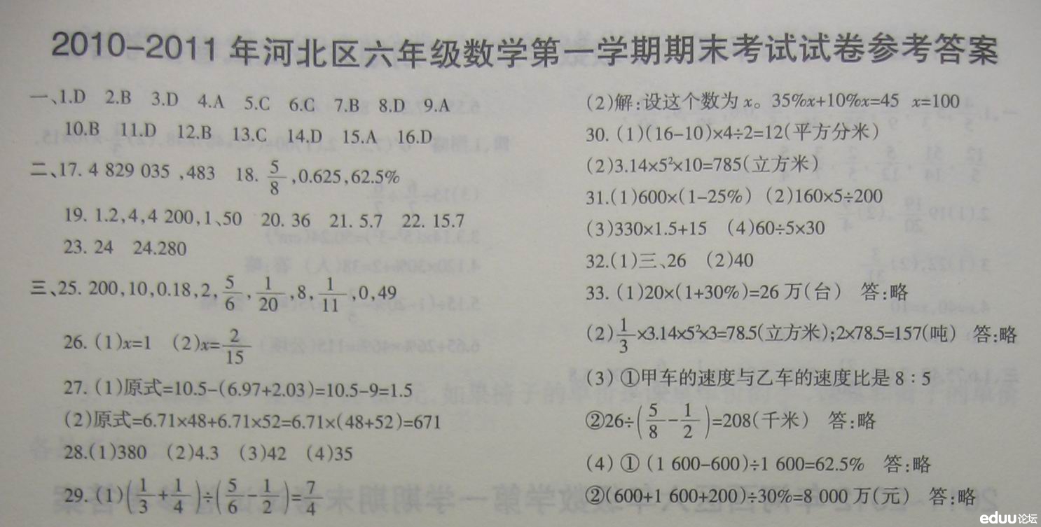 2010-2011河北区六年级数学第一学期期末试卷答案 奥数网整理 2013-01-07 10:04:15 2010-2011河北区六年级数学第一学期期末试卷答案 相关推荐: 2010-2011河北六年级数学第一学期期末试卷 天津市小学历年六年级第一学期期末考试试题及答案汇总