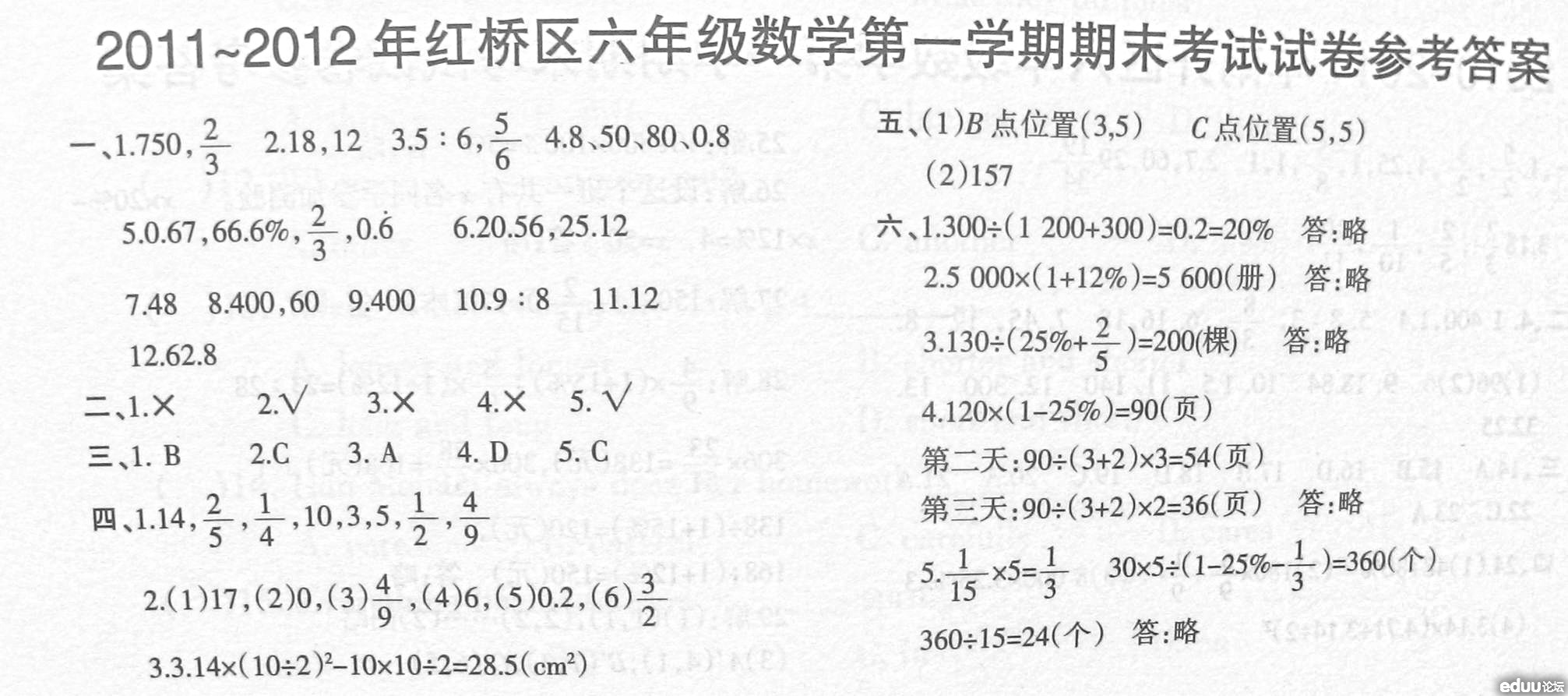 2011-2012红桥区六年级数学第一学期期末试卷答案 奥数网整理 2013-01-08 10:39:38 2011-2012红桥区六年级数学第一学期期末试卷答案 相关推荐: 2011-2012红桥区六年级数学第一学期期末试卷 天津市小学历年六年级第一学期期末考试试题及答案汇总