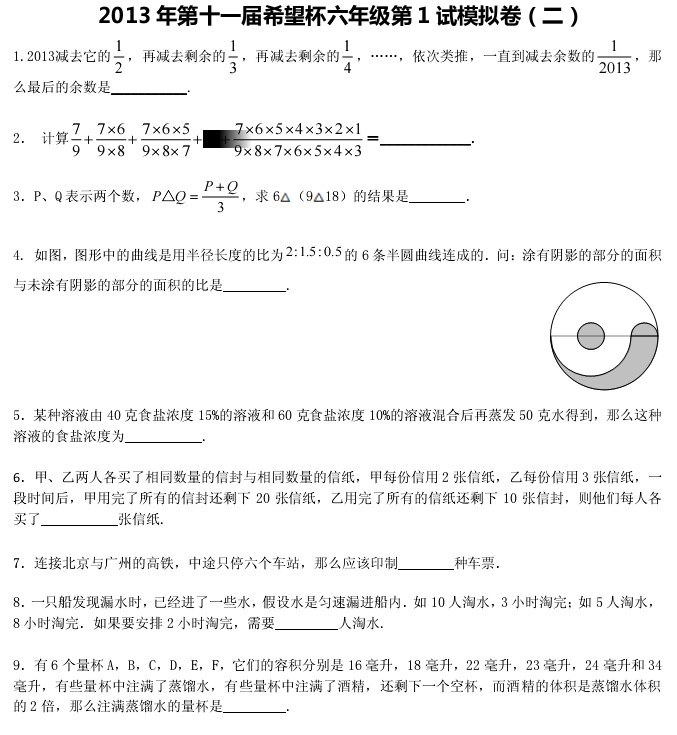2013希望杯初赛天津赛区六年级模拟考试卷(二) 奥数网整理 2013-03-15 10:13:55 2013年3月17日, 希望杯初赛开赛。小编为大家搜集三套模拟题,做最后冲刺。 请下载附件: 2013希望杯初赛天津赛区六年级模拟考试卷(二) (本地下载 ) 相关推荐: 2013希望杯初赛天津赛区六年级模拟考试卷(一) 2013希望杯初赛天津赛区六年级模拟考试卷(三) 2013华杯赛初赛天津赛区六年级模拟考试卷(一) 2013华杯赛初赛天津赛区六年级模拟考试卷(二) 2013华杯赛初赛天津赛区六年级模拟考试卷(三)