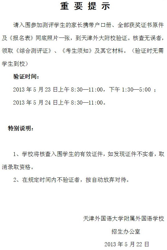 2013小外招生小卷考试重要通知