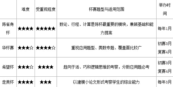 三至六年级:陈省身杯、华杯赛、希望杯、走美杯