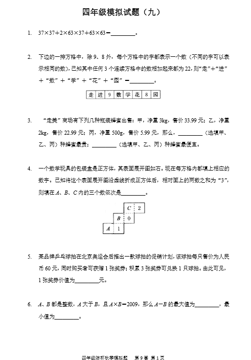 【点击下载>>>2016天津陈省身杯四年级模拟试题(9)以及答案】