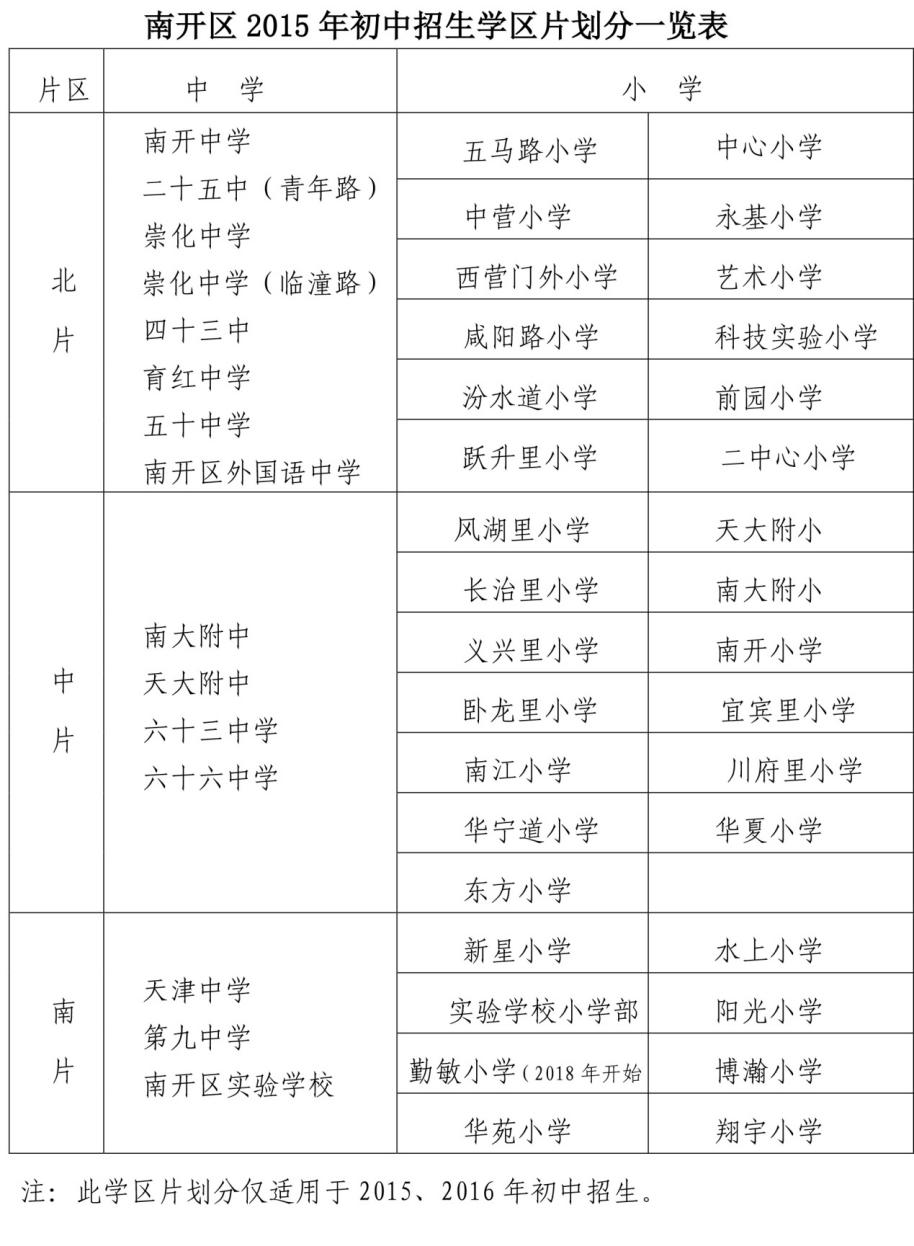 南开区将15所公办初中划分为3个学区,每学区内3至8所中学对应8至13所小学。