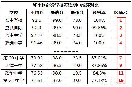 “小升初新政”后首届初一和平区部分学校英语期中成绩对比: