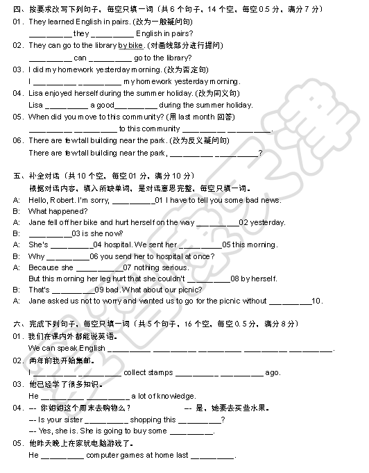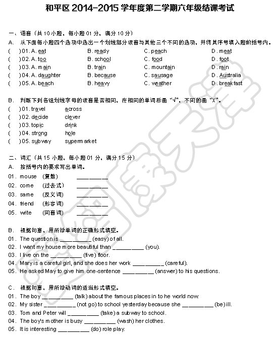 2015天津和平区六年级第二学期英语期末考试试卷