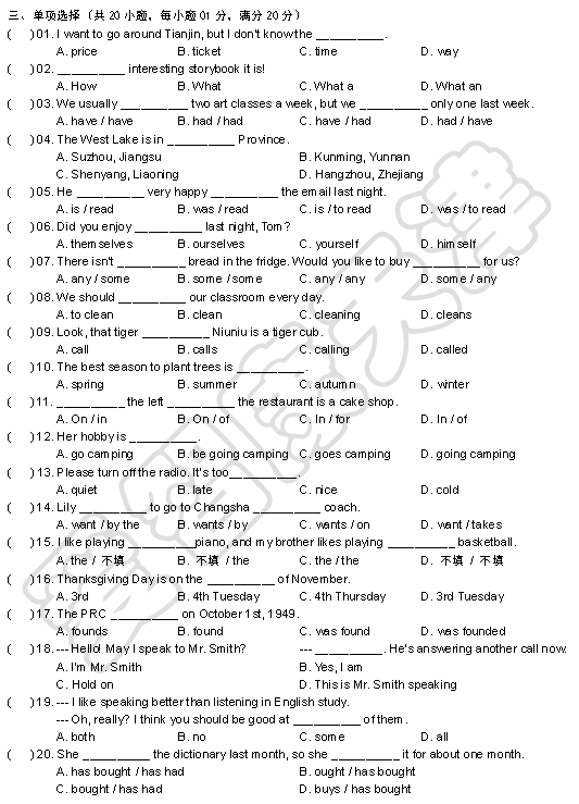 2015年天津和平区六年级下册英语期末考试试卷