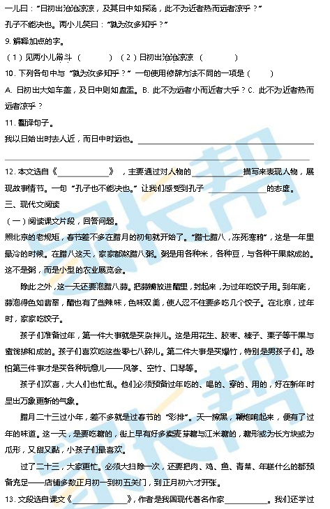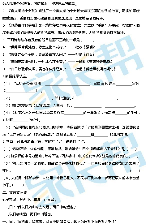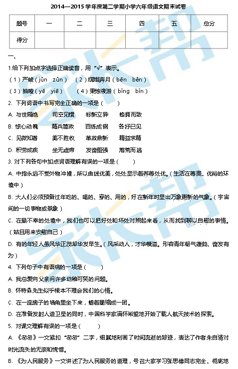 2015天津南开区六年级第二学期语文期末考试试卷