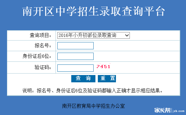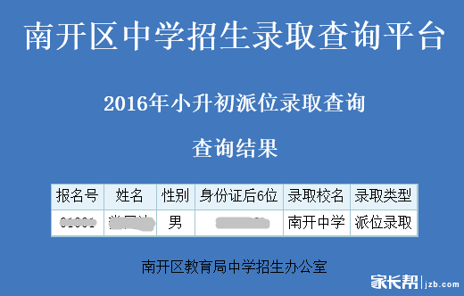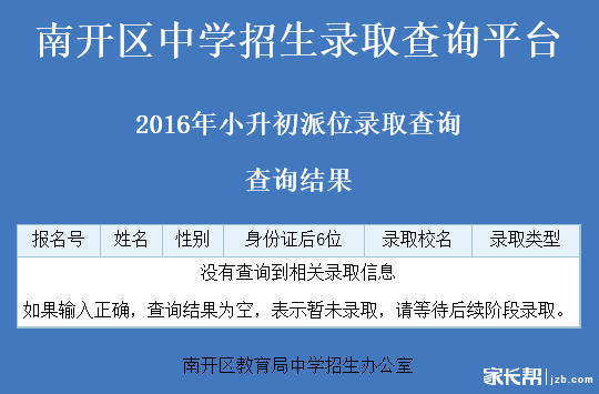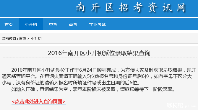 2016年南开区小升初派位录取结果查询网站已开通,具体情况如下: