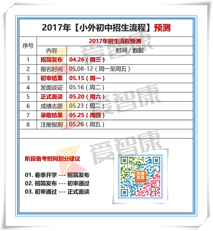 作为小升初每年最早开启招生的学校,小外的整体招生时间安排直接影响到孩子们备考的节奏和进度。为方便考生及家长更有针对性地分阶段进行备考,特别参照2015+2016连续两年小外整体招生流程,为大家进行今年的时间预测: