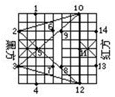 2.这是一个中国象棋盘(图中小方格都是相等的正方形,“界河”的宽等于小正方形边长),黑方有一个“象”,它只能在1,2,3,4,5,6,7位置中的一个,红方有两个“相”,它们只能在8,9,10,11,12, 13,14中的两个位置。