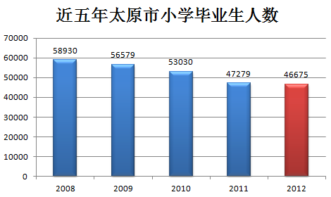 太原奥数网:太原市2012年应届小学毕业生为46675人,比2011年的47279人减少604人,比2010年的53030人减少6355人。小编统计了一下太原市近五年的小学毕业生人数,如下图所示,据此数据推测2013年小学应届毕业生人数应保持在4万6左右,趋于平衡。