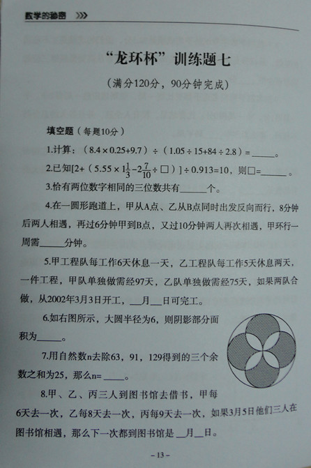 导读:2013年太原市龙环杯即将在1月24号举行,龙环杯是什么,龙环杯的试题类型有哪些呢?下面就是太原奥数网小编拿到的龙环杯训练题,大家一起来看吧。
