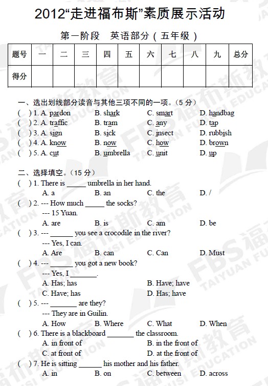 2012年福布斯杯第一阶段五年级英语真题