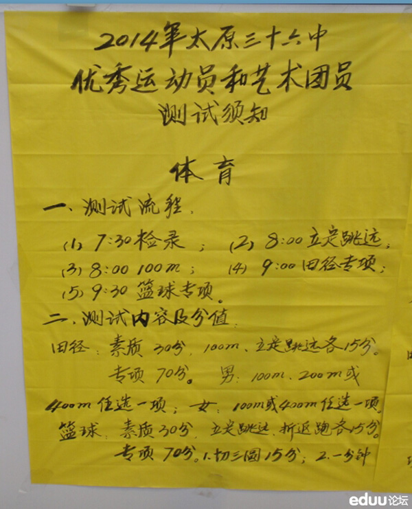 太原奥数网 小升初正式政策呼之欲出,而往年在小升初之后的特长生却已经开始了,下面是小编们去现场拍到的特长生报名条件及测试规定,和大家分享。