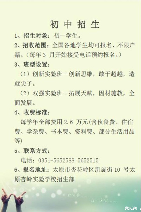 太原杏岭实验学校公布了2015小升初招生信息,招生对象为初一学生,全国各地学生均可报名,不限户籍。每学年全部费用为2.6万元。