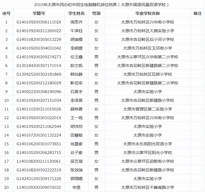 2015年太原凤凰双语学校小升初摇号名单出来了,大家快来查看自己的宝贝有没有被录取,在这里小编衷心祝福已经被录取的孩子们,祝愿你们的学习生活越来越好。