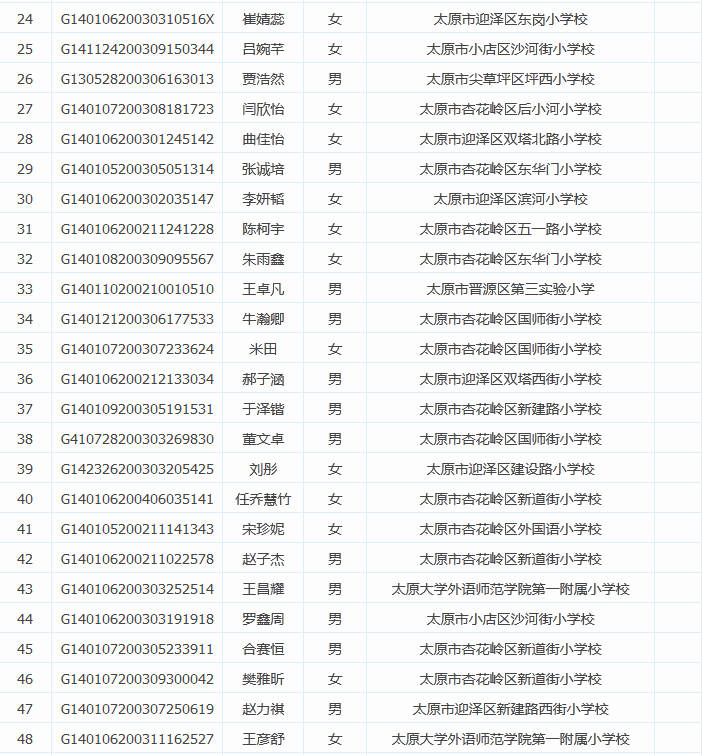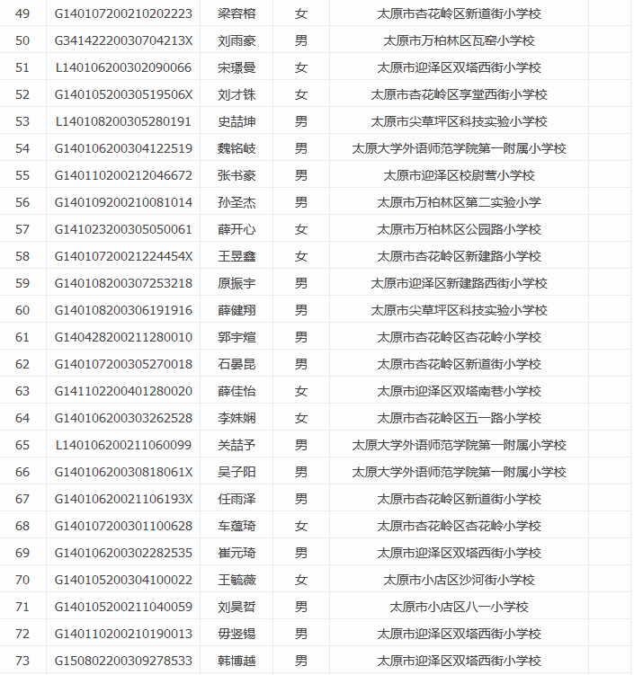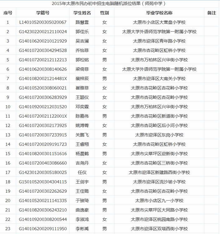 2015年太原师苑中学小升初摇号录取名单
