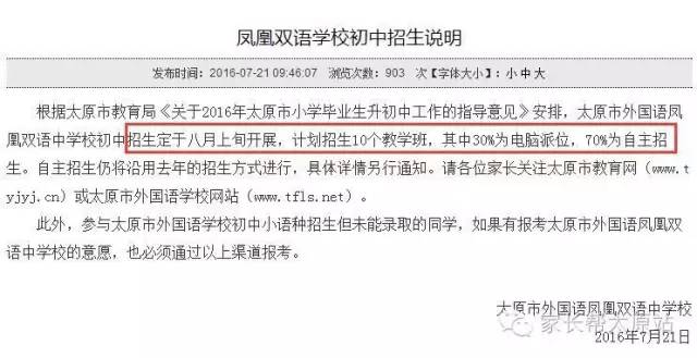 7月21日,太原市外国语学校官网贴出2016年凤凰双语学校小升初招生说明,明确指出公参民学校招生将于8月上旬开始,凤凰今年初一的招生计划仍为10个班,并且招生办法仍然是摇号(30%)+自主(70%)结合办法,下面具体来看。