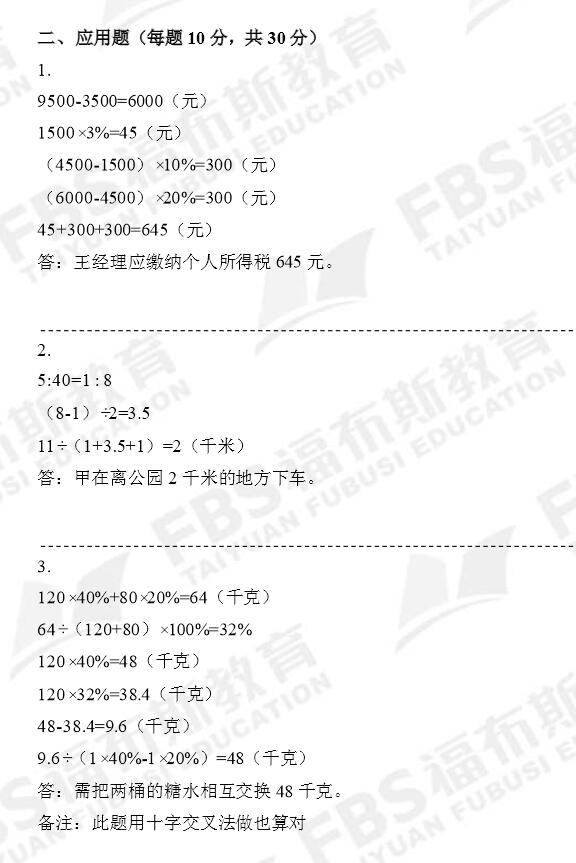 2015太原福布斯二阶段六年级数学测试题答案(2)