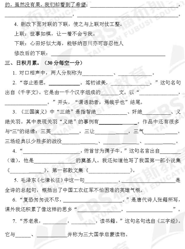 2015福布斯一阶段五年级语文测试题(3)