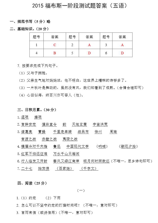 2015福布斯一阶段五年级语文测试题答案