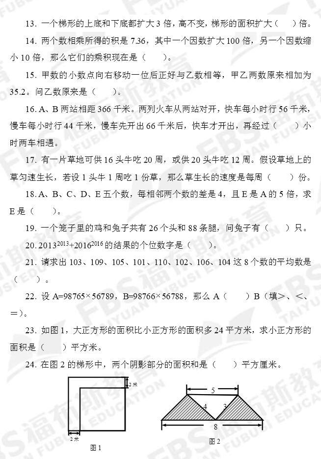 2015太原福布斯二阶段五年级数学测试题(2)