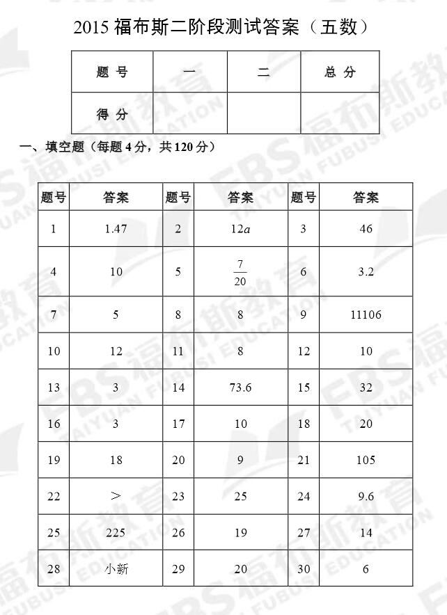 2015太原福布斯二阶段五年级数学测试题答案