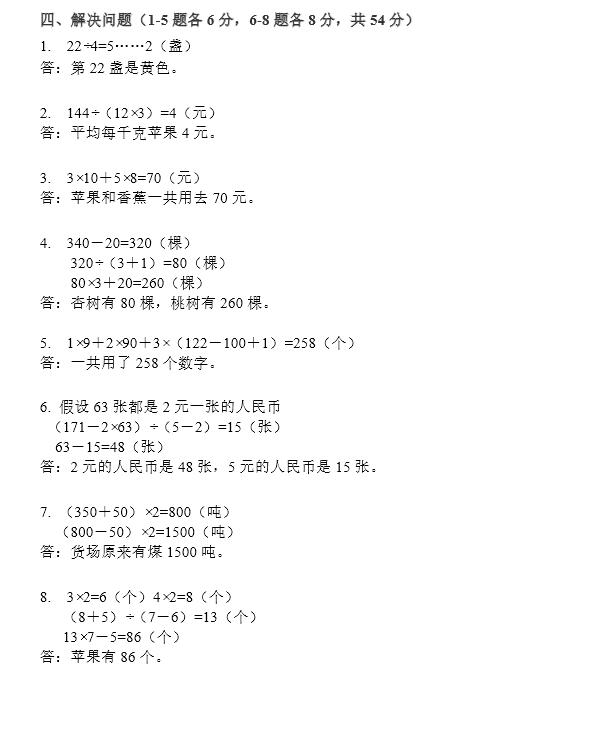 2015太原福布斯一阶段四年级数学测试题答案(2)