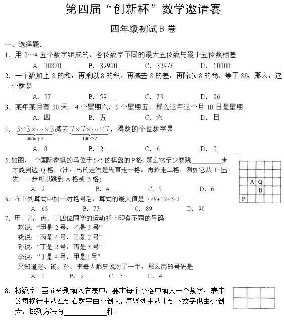 | 【第四届】创新杯小学组四年级初赛B卷 | |