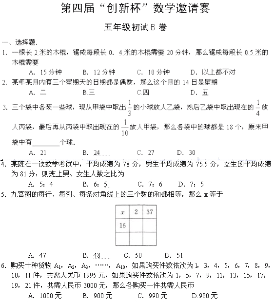 | 【第四届】创新杯小学组五年级初赛A卷 | 【第四届】创新杯小学组五年级初赛B卷 |