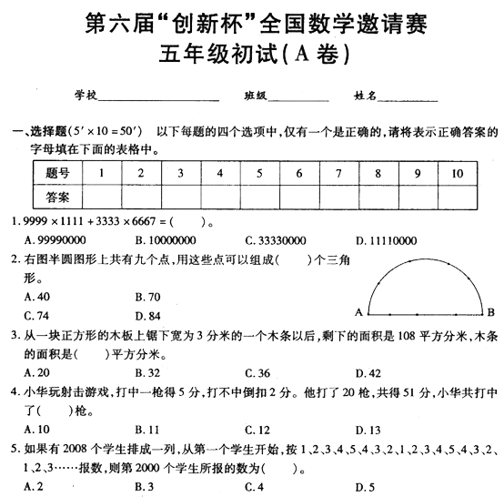 | 【第六届】创新杯小学组五年级初赛A卷 | 【第六届】创新杯小学组五年级初赛B卷 |