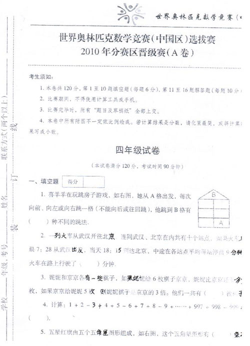 2010年世界少年奥林匹克数学竞赛四年级试卷